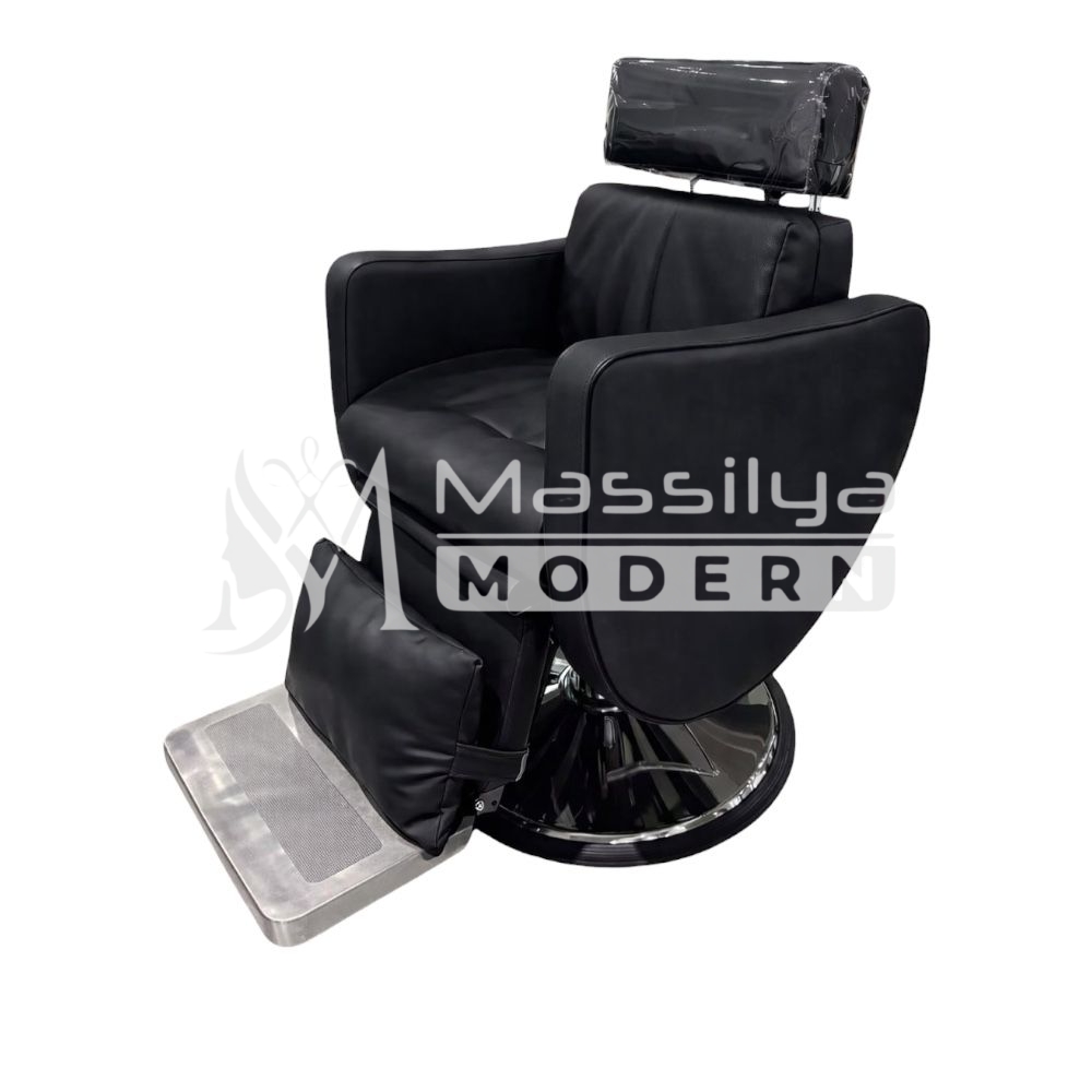 Fauteuil barber professionnel au design moderne, élégant et haut de gamme, spécialement conçu pour les barber shops et salons premium. Il combine un confort exceptionnel pour le client et une grande praticité pour le professionnel, grâce à son dossier électrique, son repose-pieds intégré et sa prise USB de recharge.