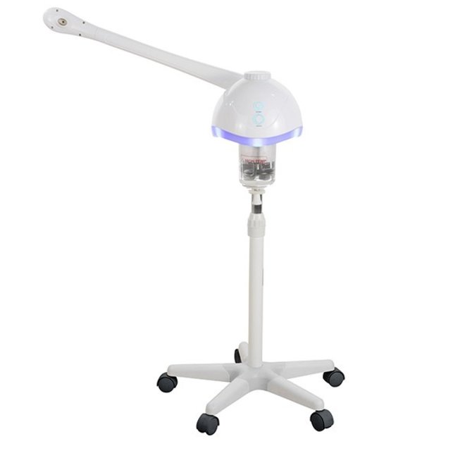 Vapozone avec un temps de chauffage court, un puissant panache de vapeur, une tête de vapeur rotative, une fonction d’ozone réglable et un support roulant réglable en hauteur (5 pieds) avec roues pivotantes, ce qui rend le vapozone facile à déplacer.