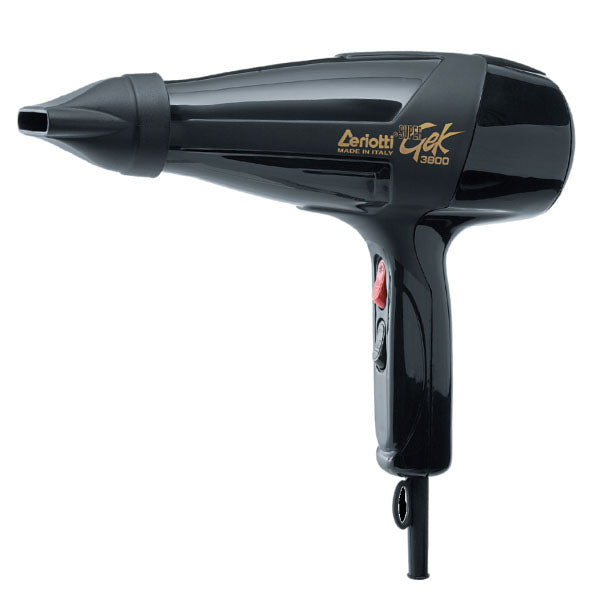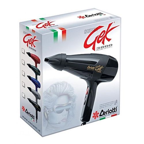 Sèche-cheveux GEK 3800 Ceriotti «CLASSIQUE», pratiquement le plus cloné au monde. Sèche-cheveux extrêmement robuste, maniable et pratique réalisé exclusivement pour le secteur professionnel. Gek 3800 avec 2 vitesses et 4 températures 1900w sélectionnables; embout G6 largeur 6 cm et embout G9 largeur 9 cm fournis ; coque externe renforcée et antichoc, indéformable à la chaleur et entièrement recyclable.
