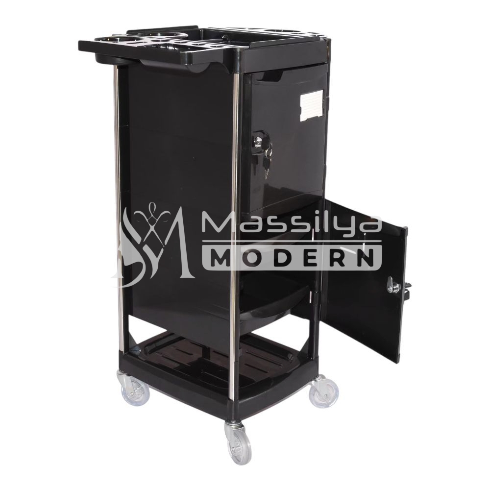 Ce chariot de rangement professionnel est conçu spécialement pour les salons de coiffure et instituts de beauté. Élégant, compact et fonctionnel, il est fabriqué en plastique ABS solide et dispose de deux tiroirs verrouillablespour sécuriser les outils et produits de valeur. Son design ergonomique et ses roulettes pivotantes à 360°garantissent une mobilité parfaite dans votre espace de travail.